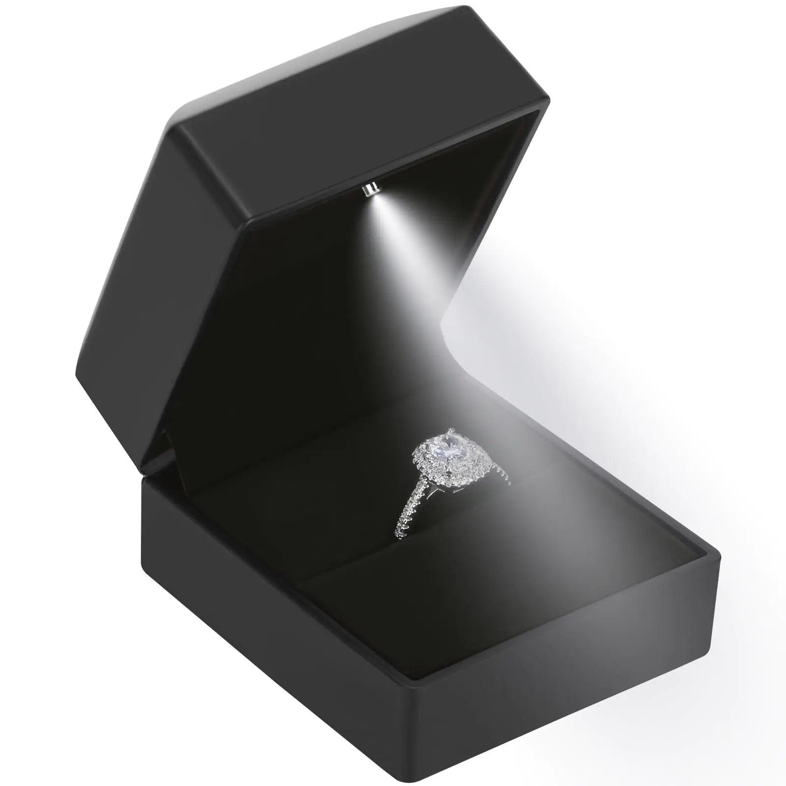 [QUALITY METERIAL - The ring box is made of high-quality plastic ABS. The surface is smooth textured wear-resistant dirt-resistant waterproof and the inner velvet is soft and comfortable which can effectively protect your jewelry from damage. LED LIGHT - There is an LED light in the ring box which allows you to open the ring box and automatically light up. The effect is amazing. The soft light shines on your jewelry making your jewelry more beautiful shining and perfectly displaying your jewelry. Size - 2.55*2.36*1.96inch/6.5*6*5cm; The small ring box is easy to carry and give your lover a big surprise when you take out and open the jewelry box. "BEST GIFT - It is perfect for special occasions such as Proposal Engagement Weddings Valentines Day Christmas Thanksgiving Mothers Day Fathers Day Graduation Birthday and Anniversaries etc surprise your lover with this romantic ring box !" Package includes: 1 piece ring box with LED light; Notice: jewelry not included]