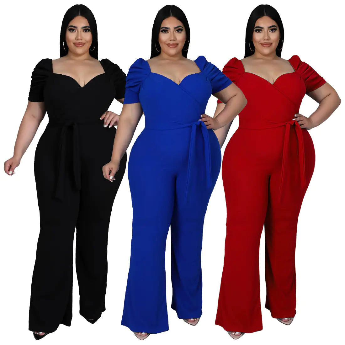 Available in a variety of colors including Red, Black, and Blue, and sizes ranging from L to 4XL, this jumpsuit caters to all body types, ensuring everyone can enjoy its stylish charm.